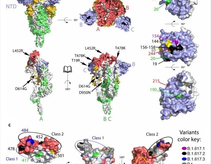 Les mutations de pointe identifiées dans la variante B.1.617.2 ont montré un schéma de distribution similaire à celui des autres COV. Outre la mutation D614G, la mutation D950N a été identifiée dans l’interface trimère. La majorité des mutations NTD étaient présentes dans le «supersite», qui est la cible principale des puissants anticorps neutralisants anti-NTD. De même, toutes les mutations RBD ont été identifiées dans la périphérie de la surface de liaison de l’enzyme de conversion de l’angiotensine 2 (ACE2), indiquant que le variant B.1.617.2 acquiert ces mutations pour éviter la liaison de l’anticorps sans entraver la liaison de l’ACE2.
