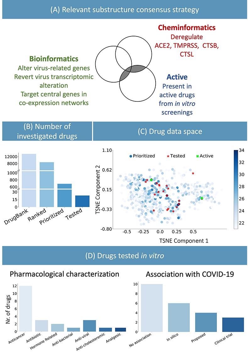 (A) Stratégie de consensus pour identifier la sous-structure chimique pertinente, en utilisant des méthodes bioinformatiques et chimico-informatiques ainsi que des résultats expérimentaux de la littérature publiée. (B) L’approche suggérée permet de réduire le nombre de tests expérimentaux : l’ensemble de la base de données DrugBank a été filtré à moins de 800 médicaments pertinents et des tests in vitro ont été effectués sur 23 candidats. (C) Représentation graphique des médicaments prioritaires. La nuance bleue représente le nombre de sous-structures chimiques identifiées en (A), présentes dans les médicaments. Les 23 composés sélectionnés sont affichés en rouge. Ils ont été sélectionnés parmi les médicaments partageant la sous-structure la plus pertinente et répondant à des critères logistiques pratiques. Sur les 23 médicaments, les deux surlignés en vert ont été identifiés expérimentalement comme actifs. (D) Caractérisation pharmacologique et description de l’association connue avec COVID-19 des 23 médicaments testés. In silico fait référence aux médicaments dérivés d’études in silico, tandis que proposé fait référence aux médicaments suggérés pour leur rôle thérapeutique potentiel dans la littérature.