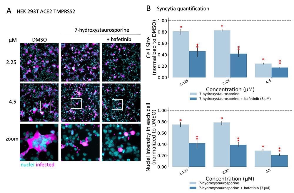Les chercheurs ont découvert que deux médicaments, la 7-hydroxystaurosporine et le bafetinib, ont montré une inhibition significative de l’infection virale. De plus, l’analyse des images des cellules infectées par rapport aux cellules traitées a montré que la formation de cellules syncytiales multinucléées était également significativement réduite. De manière inattendue, lorsqu’ils sont combinés, les deux médicaments ont exercé une inhibition synergique encore plus puissante de l’infection virale ainsi qu’une inhibition de la fusion cellule-cellule à des concentrations plus faibles. Davantage in vitro des expériences ont montré que les médicaments combinés étaient efficaces même après une heure d’infection des cellules. Cela suggère que la combinaison pourrait avoir entravé un mécanisme de post-entrée du virus. De plus, les résultats ont également confirmé l’efficacité de la combinaison des médicaments contre la variante delta plus infectieuse du SRAS-CoV-2.